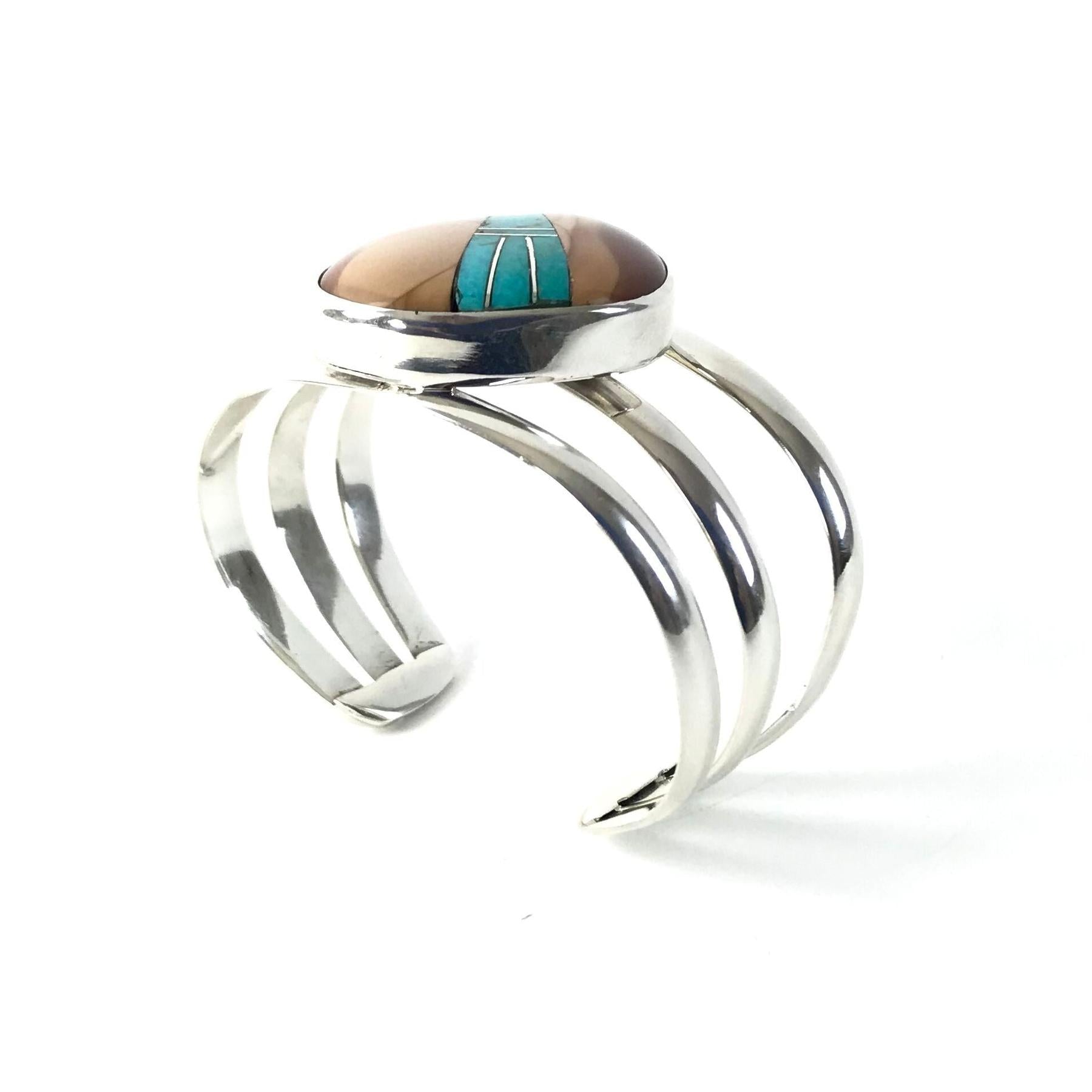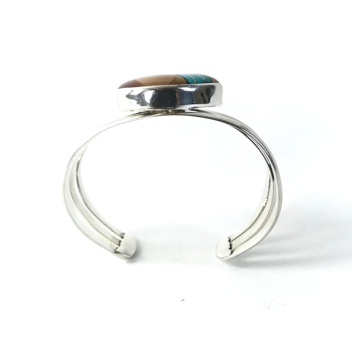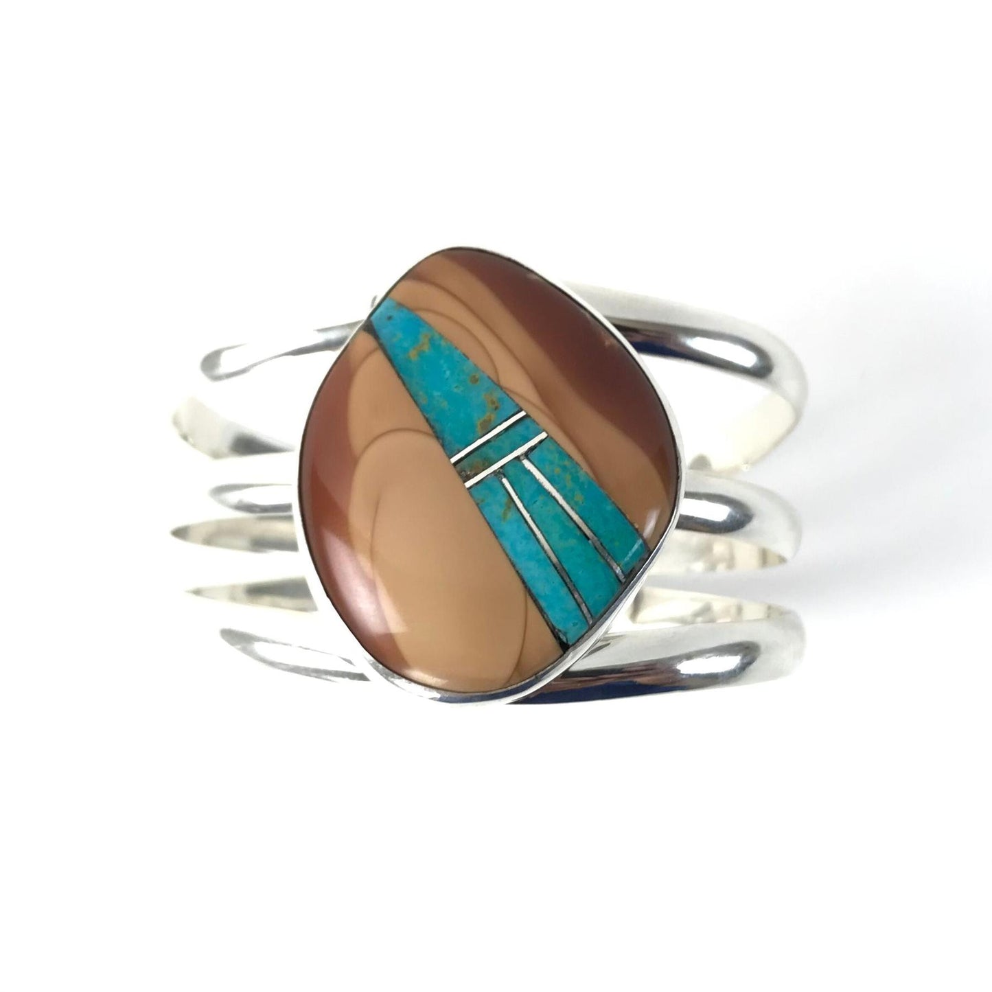 Ellouise Padilla Toya of Santo Domingo Pueblo has created a bold and unique statement cuff bracelet. Using techniques taught to her by her parents, she takes traditional jewelry-making techniques and adds a modern flair.Known for her skill and artistry Padilla created this wire framed sterling silver bracelet. Featuring a stunning inlaid centerpiece of Brown jasper and Kingman Turquoise. A statement piece of wearable art to elevate your collection.