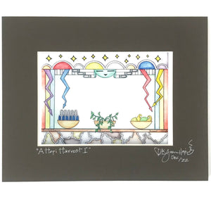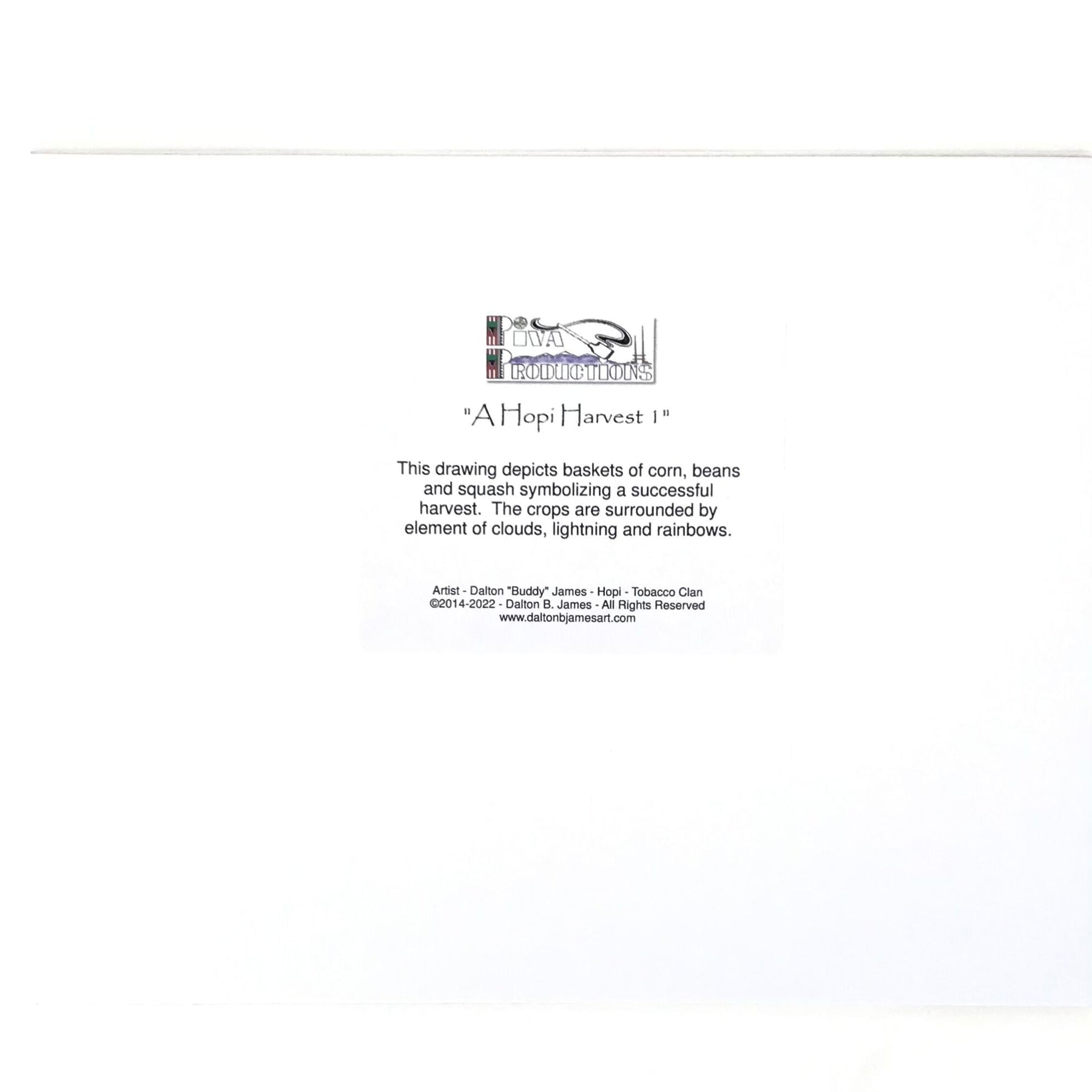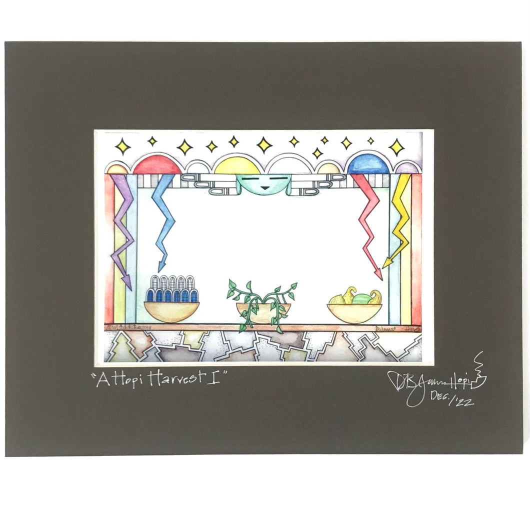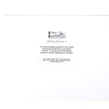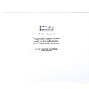 The Three Sister crops are a necessity in Southwestern culture. They bring blessings, as well as nourishment. This image depicts baskets of corn, bean and squash symbolizing a successful harvest. The crops are surrounded by elements of clouds, lightning and rainbows in a double-matted 10 x 8 print.