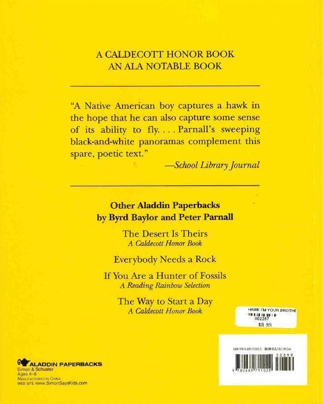 With black and white sketches and poetic words, we learn of a young boy who is fascinated with birds, the sky, and flight. In his quest to fly he captures a hawk only to learn of the importance of being free.