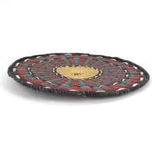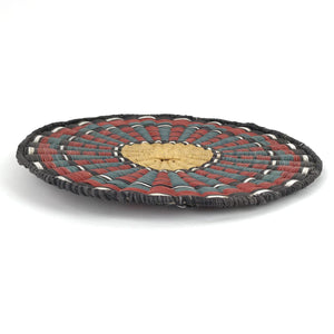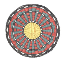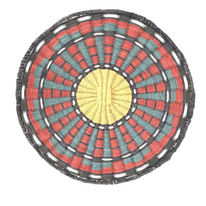Handcrafted by Pearl Sewenewa, this exquisite basket is a fine example of a celebrated art that has been practiced by generations of Hopi women. In Hopi culture, baskets are used for both ceremonial and everyday functions and are made in much the same way today as they were centuries ago. There are three techniques for making Hopi baskets: wicker, plaiting and coiling. This wicker plaque baskets is made from sumac and rabbit brush, where plant fibers are wrapped around a central stem of bundled plant fiber. Betty has create geometric patterns and highly dimensional designs in yellow, blue, red and black hues that come from both natural and synthetic dyes. A revered art form passed down through generations, baskets continue to play an important cultural role in Hopi life.