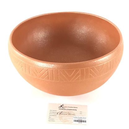 This remarkable etched bowl was handmade by Ohkay Owingeh artist Clarence Cruz using traditional methods. Created from micaceous clay, this pot is a utilitarian piece that can be used for cooking and storage. Beautifal linear etchings accent the rim of the bowl.