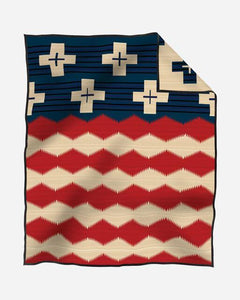 Soldiers from many tribes have fought in battle and five Native Americans have been awarded the Medal of Honor for bravery “above and beyond the call of duty.” The design marries modern asymmetry and vintage Americana. The unique striations, using pulled out yarns, reflect an era when dyes were made from plants.