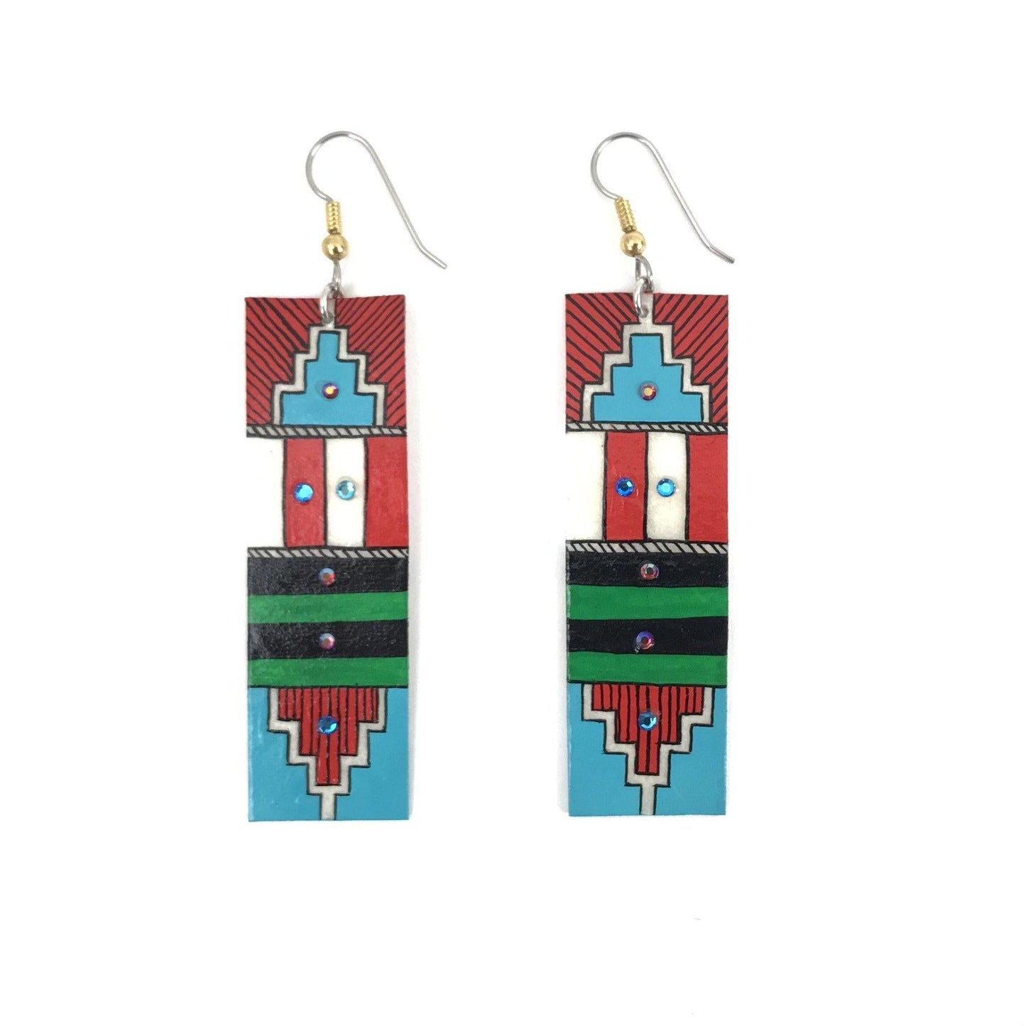 Handcrafted by Cochiti Pueblo artist Dominic Arquero, these rectangular rawhide earrings are carefully hand-painted with traditional patterns of red, black, green, and turquoise. Each design is a pattern seen on traditional regalia such as belts and kilts. These earrings have additional beaded elements incorporated to enhance their style.