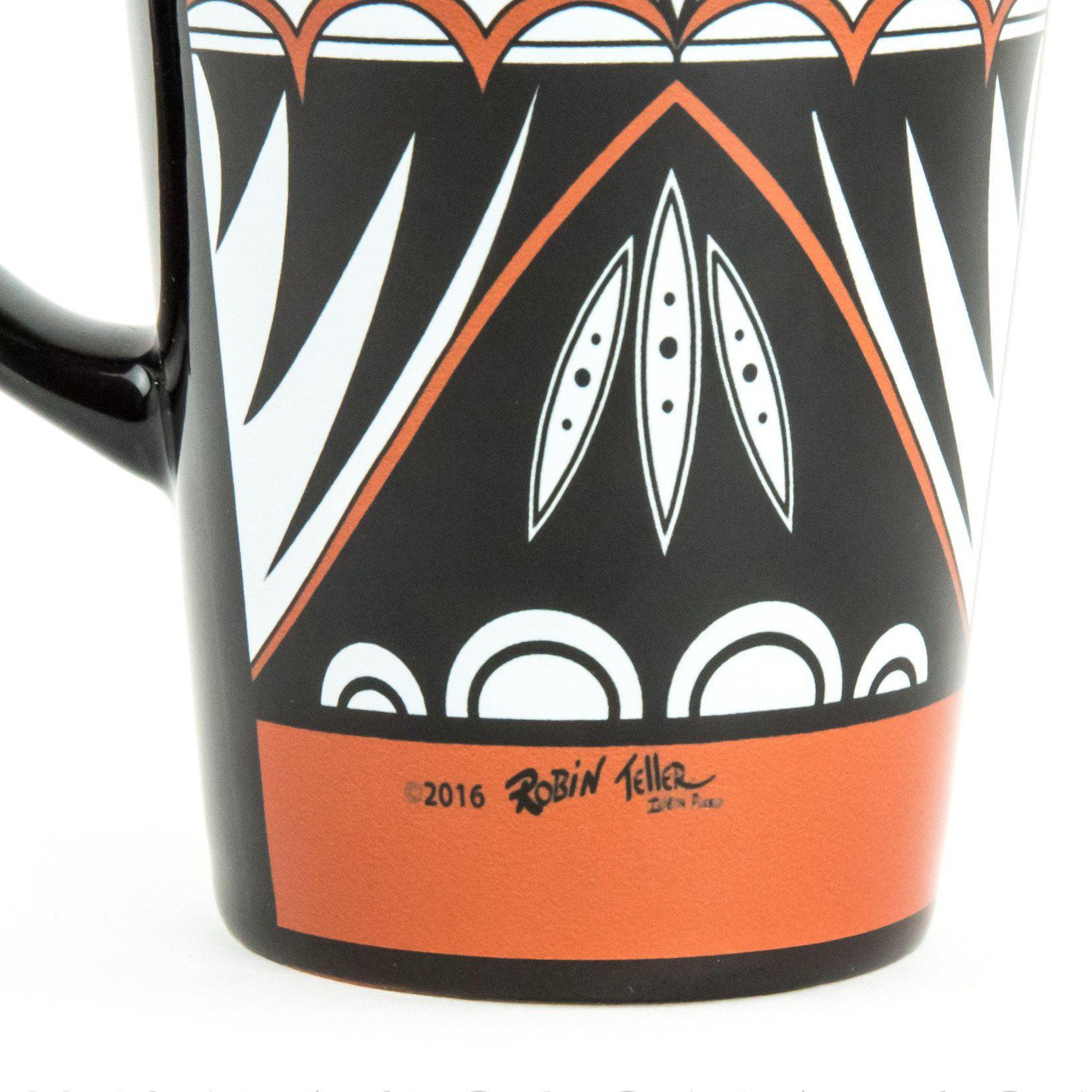 An Indian Pueblo Store exclusive! This unique 16oz café-style ceramic mug is a replica of a single beautiful clay pot handcrafted by Isleta Pueblo potter Robin Teller. Robin hand-coiled and sculpted the original according to age-old methods and painted traditional symbols in natural black and orange pigments on a white background. Daughter of renowned artist Stella Teller, Robin is one of only a handful of artists carrying on the pottery legacy in Isleta today. This replica is practical way to bring the beauty of traditional Pueblo pottery designs into your everyday life, and also makes a great gift.