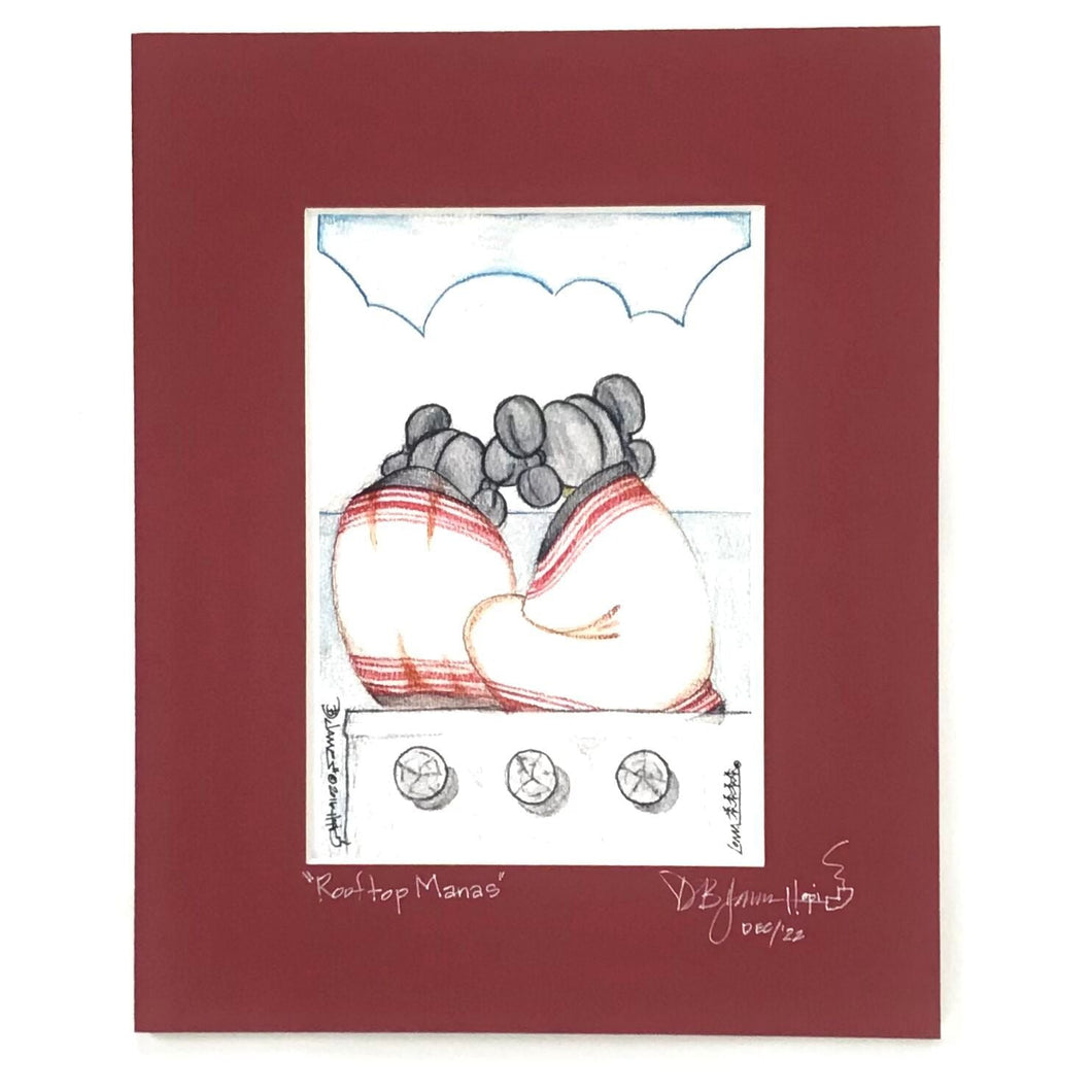 This drawing depicts two Hopi maidens watching the dances from the rooftop. They are dressed in traditional Hopi clothing along with the famous "Squash Blossom" hair dressing in a matted 8" long and 10" wide.