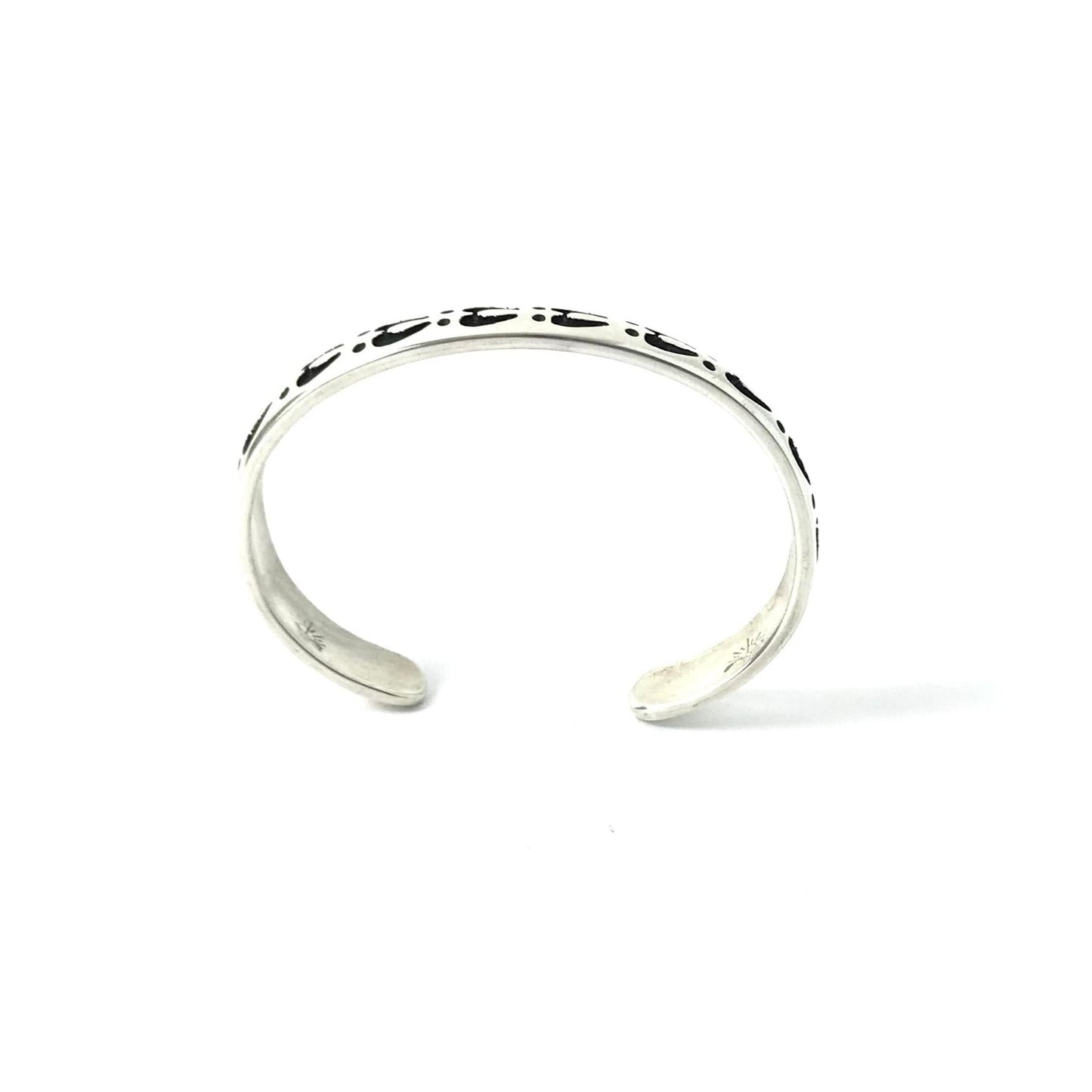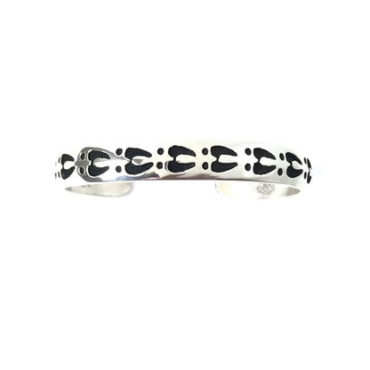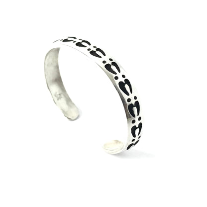 This highly detailed sterling silver cuff bracelet is a remarkable example of the silver overlay technique developed by Hopi silversmiths. Handcrafted by Hopi artist Anderson Koinva, this sophisticated bracelet features stylized cutout patterns that represent, the whirling clouds. The polished top layer of sterling silver contrasts beautifully with the oxidized silver beneath, adding depth and dimension. Versatile and lasting, this masterful cuff bracelet honors the traditions and culture of the Hopi people.