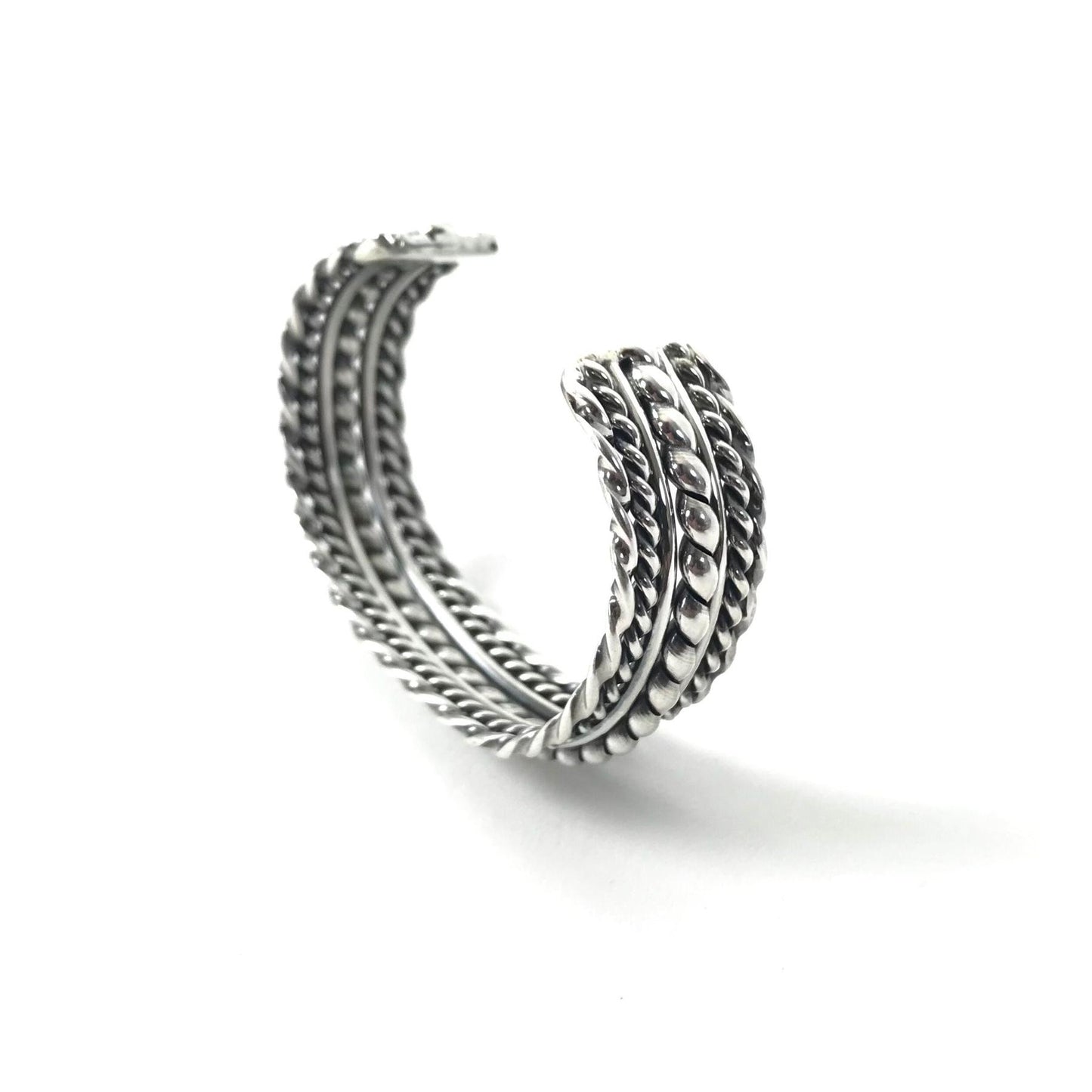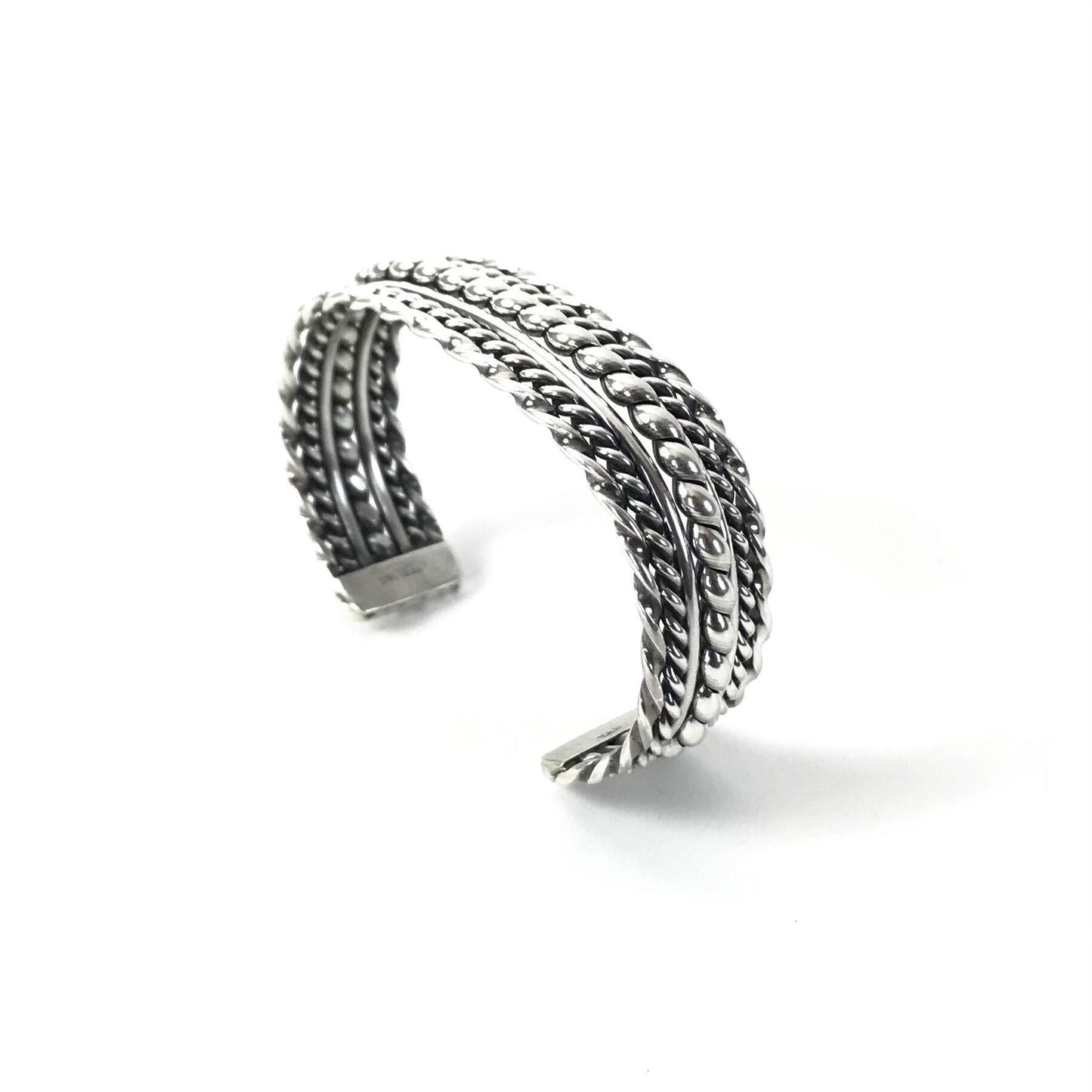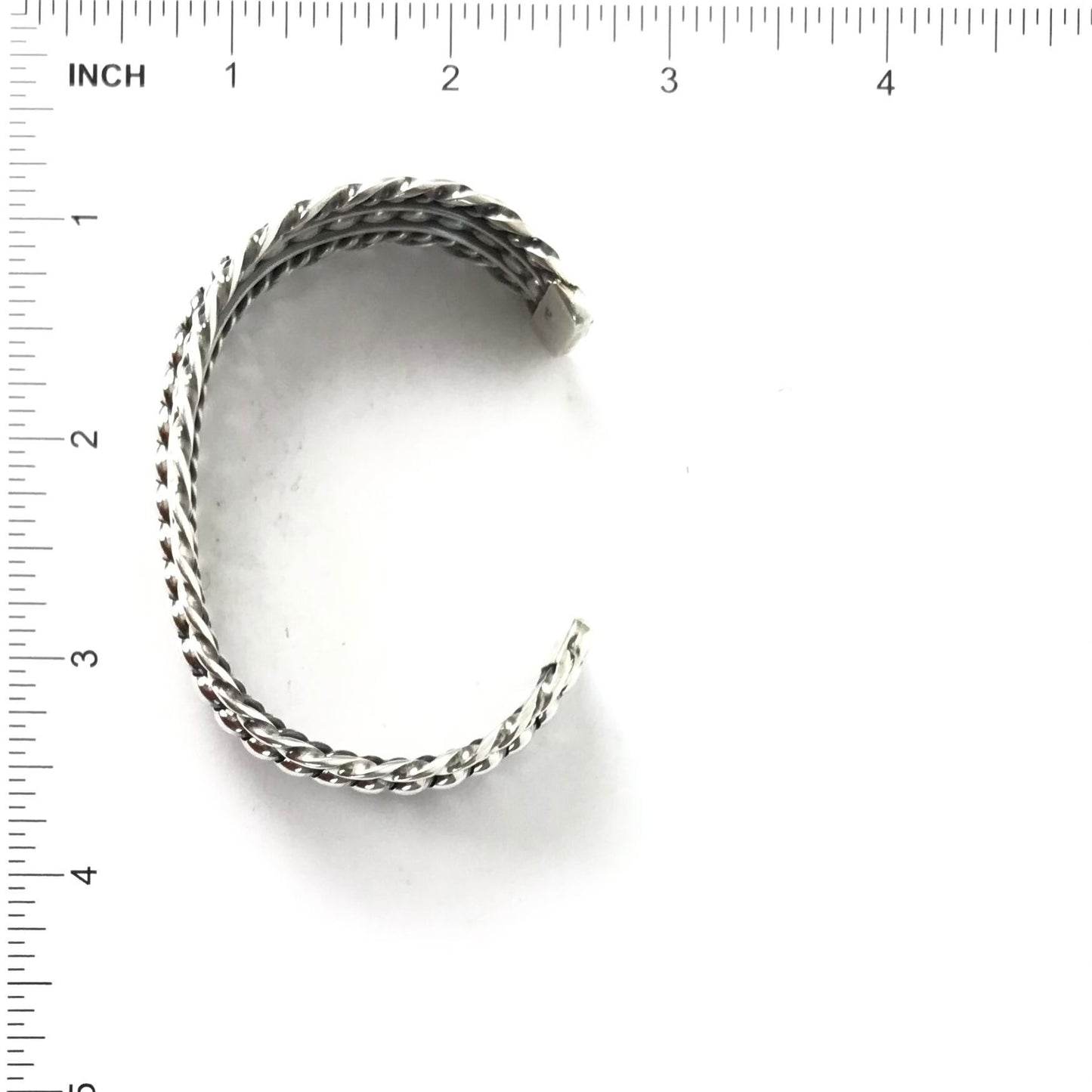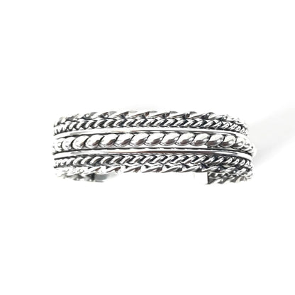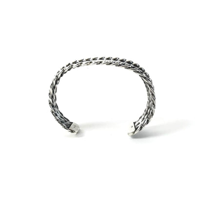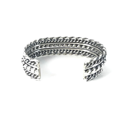 This sterling silver cuff bracelet handcrafted by Navajo artist Verna Tahe is a vision of elegance and versatility. The lightweight piece features a design of sterling silver twisted rope details set side by side. The center rope detail is raised slightly, adding dimension and texture to this classic bracelet. A polished complement to anything in your wardrobe, this iconic cuff bracelet showcases the beauty of sterling silver and the craftsmanship of Native American silversmiths.