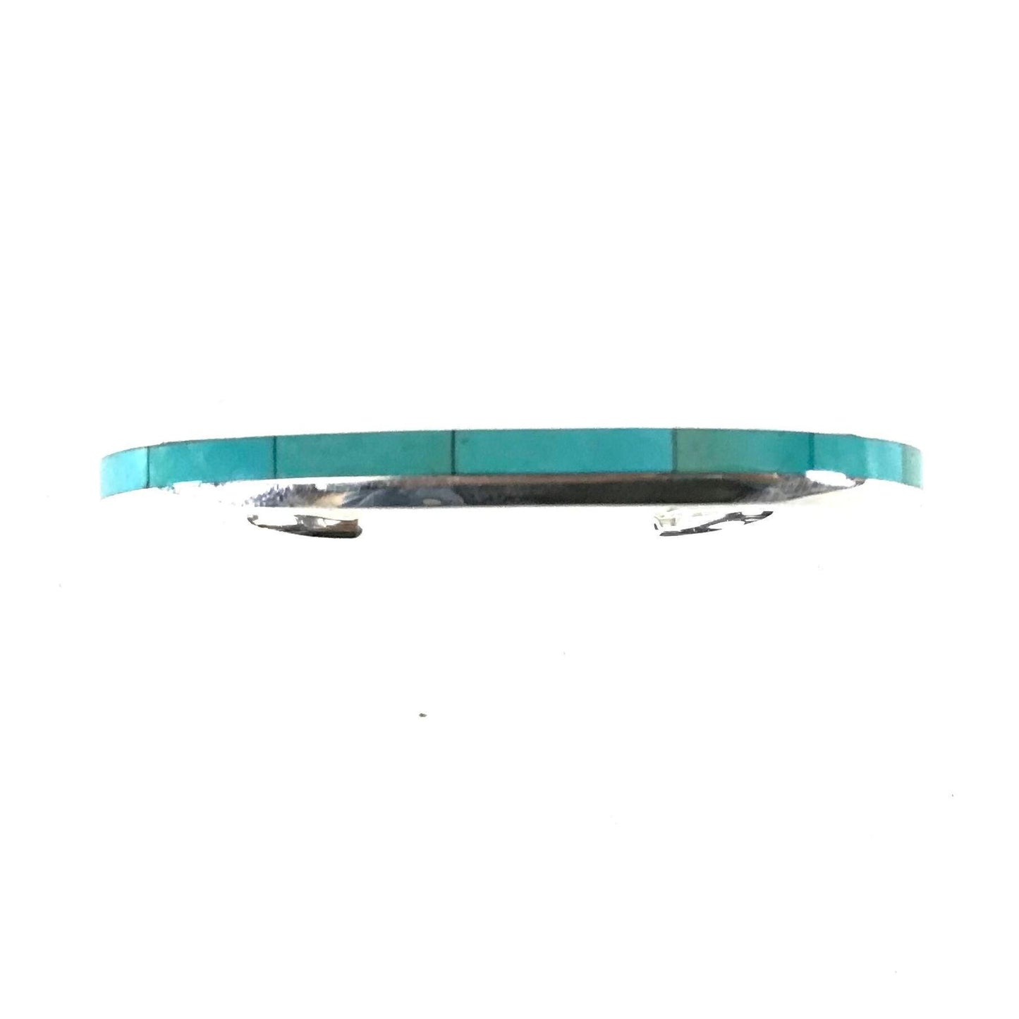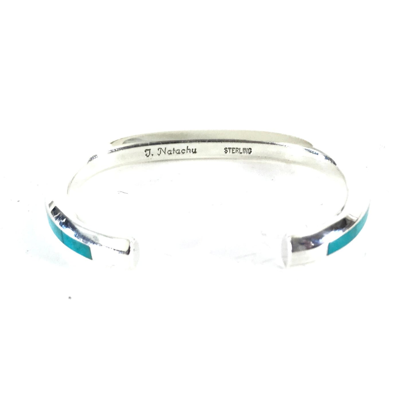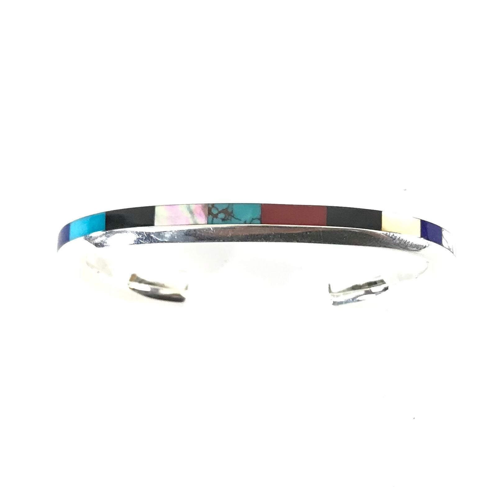 Handcrafted by Zuni Pueblo artist Troy Natachu, these timeless sterling silver cuff bracelets were crafted with heavy gauge sterling silver and channel inlaid. Using the channel inlay technique Troy carefully placed stones within a smooth sterling silver border to create a unique and classic look that can be stacked with other bracelets or worn alone, making it a design that complements every style. Cuff bracelets available with Kingman turquoise, coral, lapis and a multi-gemstone with a variety of stones and colors.