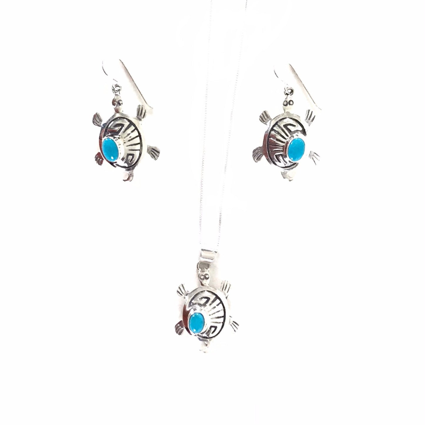 This sterling silver overlay turtle earring and pendant set were handcrafted by Native American artists.