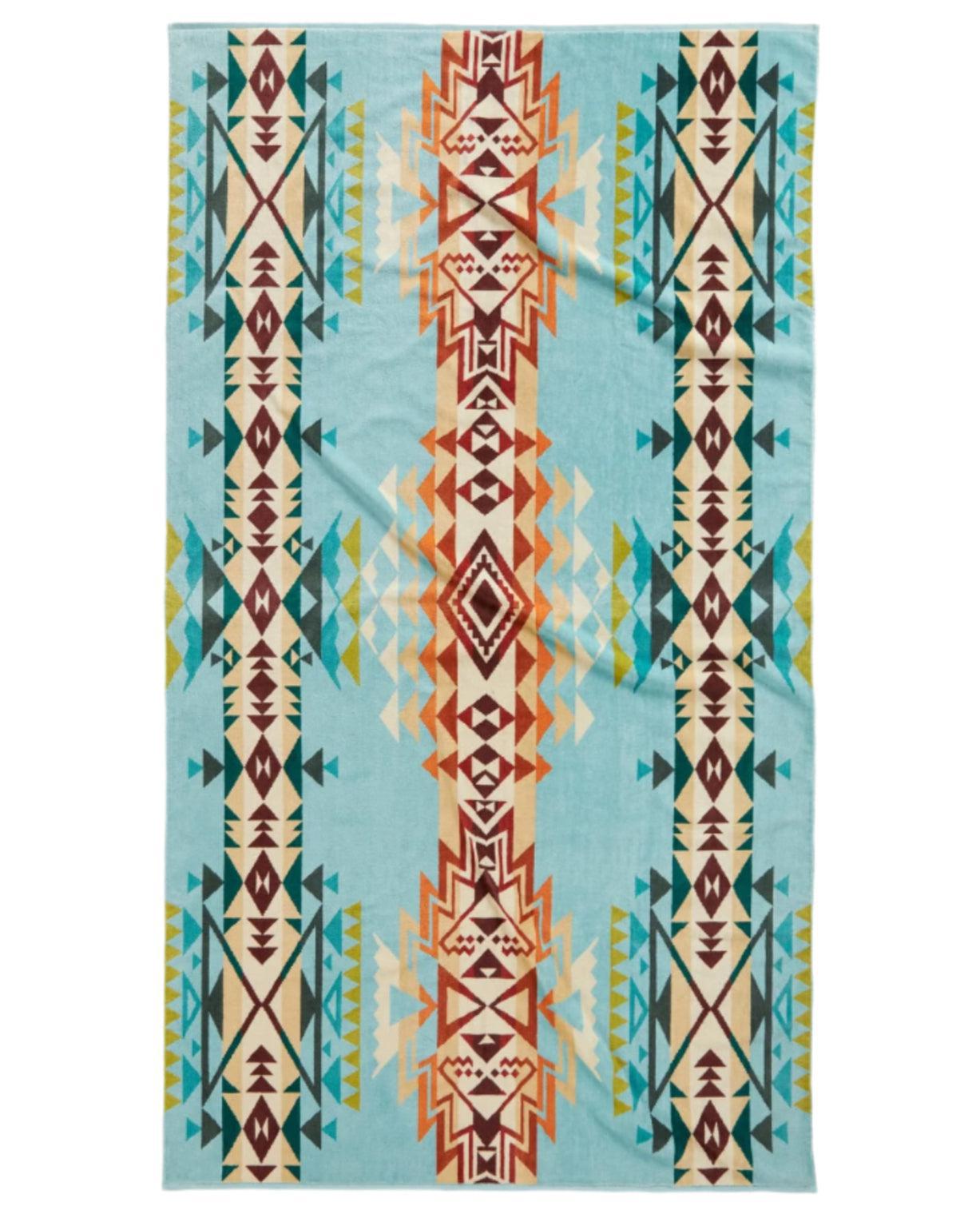 Supersized towel featuring the exclusive Highland Peak pattern, woven of cotton velour in vivid colors that stay true, wash after wash. Sheared on one side for softness, looped on the other for superior absorption. A luxury you'll love for the beach, hot tub or pool.